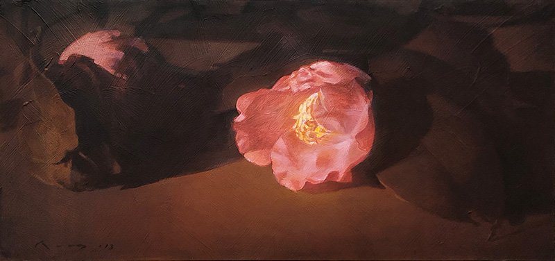 10 年来続けてきた紅椿の連作 から、最近は、淡紅の椿の連作を描いております。